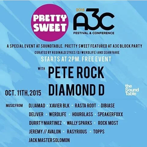 This Year we are teaming up with A3C for the Pretty Sweet party at the Sound Table. Curated by Sean Fahie And Reginald Sykes. This year we have the dope line up with all your favorite DJ's with Headliners The Legendary Pete Rock and Diamond D!! Oh man if you been to a pretty sweet you know how we get down..