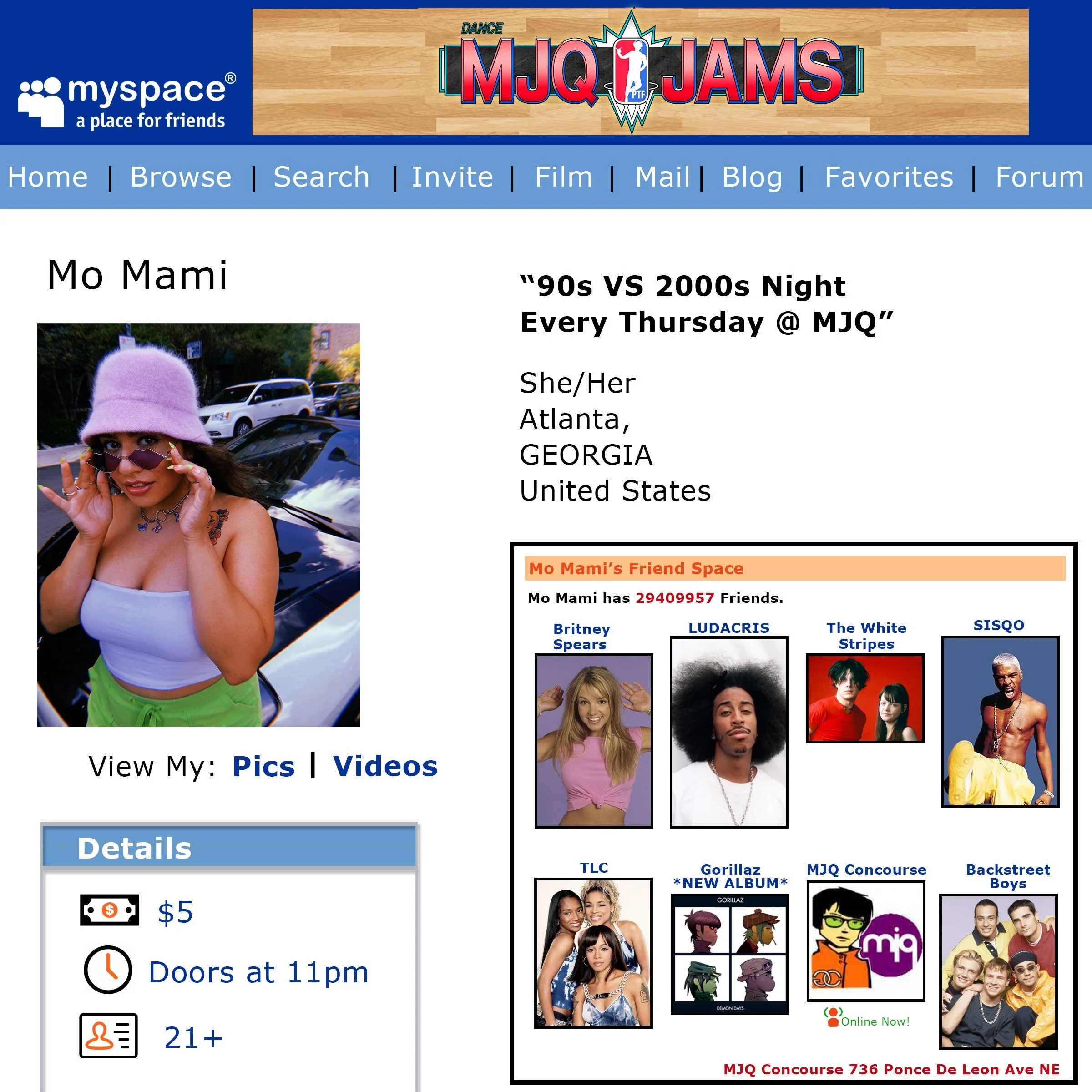 90s - 2000s at mjq featuring Mo Mami Thursday, October 20, 2022 11:00 PM 23:00 Friday, October 21, 2022 2:30 AM 02:30 Mjq concourse 736 Ponce De Leon Avenue Northeast Atlanta, GA, 30306 United States (map) Google Calendar ICS Pull up on me and Mo Mami this Thursday at MJQ . She is flying in from Chicago to Jam out with us! @MomamiMusic